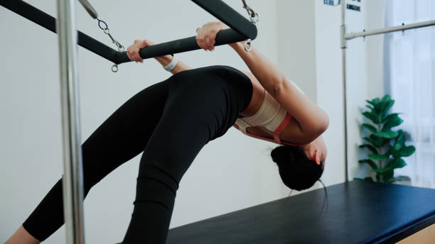 Woman performing a pilates backbend exercise on a reformer machine for flexibility and core strength